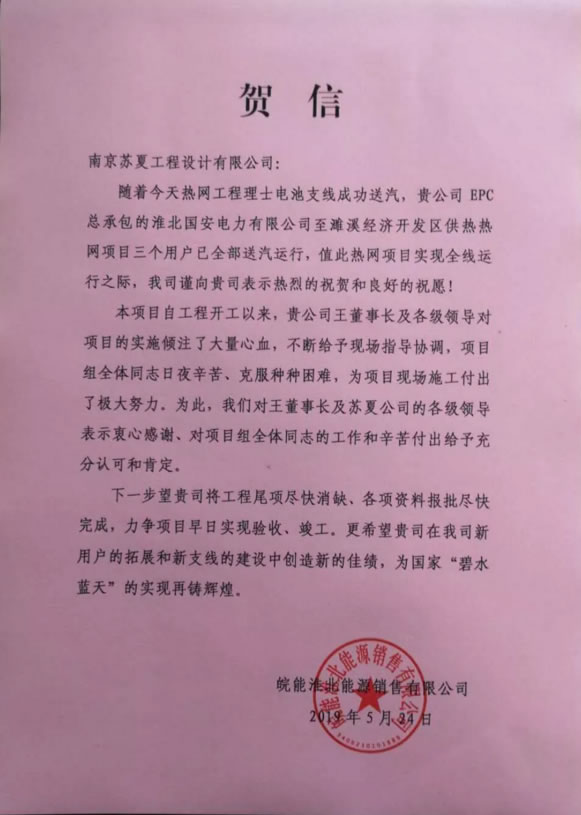 由江苏苏夏能源集团EPC总承包的“淮北国安电力有限公司至濉溪经济开发区供热项目”于5月24日完成了对第三个用户的供汽,至此该项目合同中约定的三个主要用户已全部实现了供汽,这也标志着该热网项目完成了全线运行。为此,该项目的业主单位皖能淮北能源销售有限公司专程发来贺信,充分肯定了江苏苏夏能源集团为该项目所付出的辛勤努力,同时对苏夏集团董事长王国兴等领导及淮北项目部全体人员表示感谢!同样的,江苏苏夏能源集团也要感谢皖能集团廖雪松总经理、国安电力李建河总经理、孙涛副总经理、杨晓东副总经理及皖能售能公司同仁们给予苏夏项目部的大力支持!