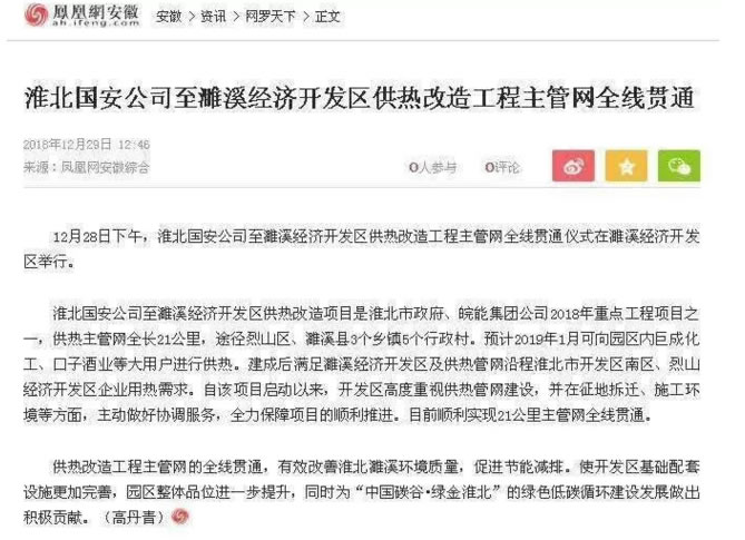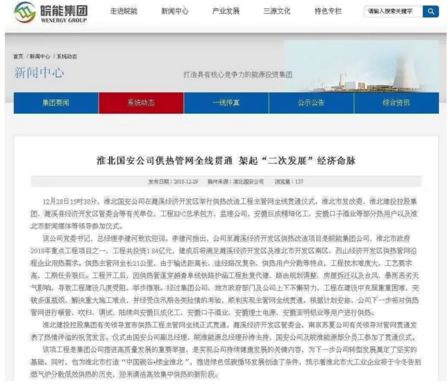 淮北国安电力有限公司供热管网的全线贯通,对其公司及淮北当地的经济发展具有非凡的意义——不仅为淮北国安电力有限公司进一步的转型发展奠定了坚实的基础,同时,也为淮北市打造“中国碳谷?绿金淮北”,推进绿色低碳循环发展创造了条件,预示着淮北市大工业企业将告别燃气炉分散低效供热的历史,迎来清洁高效集中供热的新阶段。这一供热行业的盛事,引来了当地热电行业及主流媒体的争相报导。