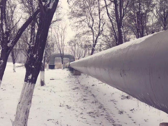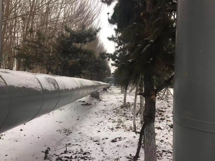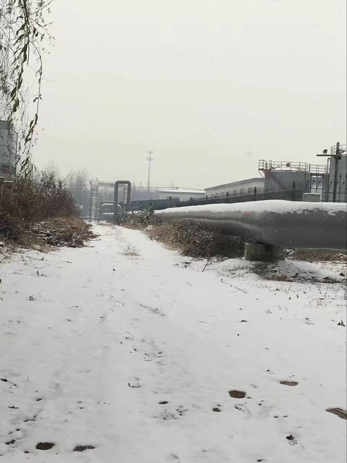 南京苏夏工程设计有限公司的"长输热网方法"/"低能耗输送蒸汽管技术"发明专利技术在沈阳市华顺供热项目中成功运用,下列图片为刚成功投运的输送距离20公里蒸汽管道在雪中的场景,管道介质压力1.0Mpa,温度300度。蒸汽管道外表面上部积雪情况。