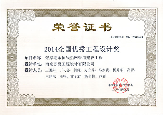热烈祝贺我司张家港永恒线热网管道工程获得2014全国优秀工程设计奖
