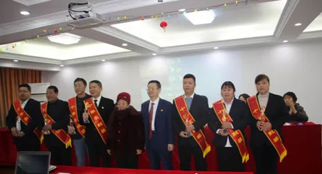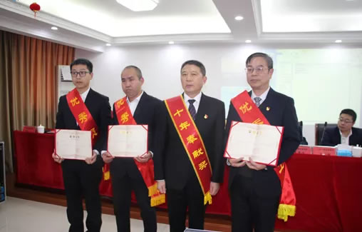 集团公司领导王国兴总裁、丁巧芬常务副总裁、王云超副总裁、江苏龙英薛瑞方总经理分别为龙英先进员工(陶致和、金文炳、顾荣金)、集团先进员工(黄小如)、集团标兵(谢军伟)和“十年以上老员工”(薛瑞方、宦健俊、芮明峰、黄小如、潘腊琴、王兴妹、周志平)颁发荣誉证书和纪念品。
