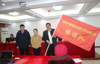 接着进行授旗仪式,由集团常务副总裁、设计公司总经理、南京苏夏建筑安装工程有限公司董事长丁巧芬女士向南京苏夏建筑安装工程有限公司总经理王帅授旗,王帅总经理再向保温队队长王国庆带领的保温施工队进行授旗。