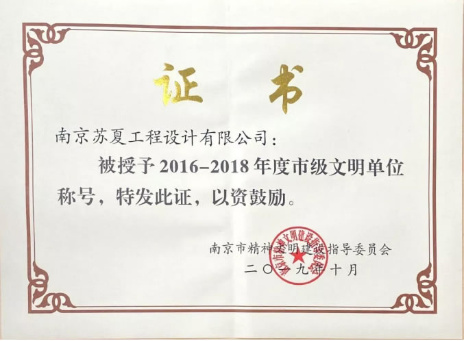根据江苏省、南京市文明办工作部署,按照《关于组织开展2016-2018年度省、市级文明单位、文明社区、文明村镇和市级文明行业推选工作的通知》(宁文明办【2019】16号)要求,鼓楼区在全区范围内组织开展了2016-2018年度省、市级文明单位(社区)推选工作。经过各项严格的资格审查、抽查考核、层层评选,南京苏夏工程设计有限公司以很高的综合评分,从众多候选单位中脱颖而出,被授予“2016-2018年度市级文明单位”称号。