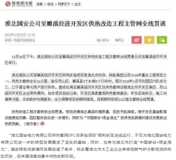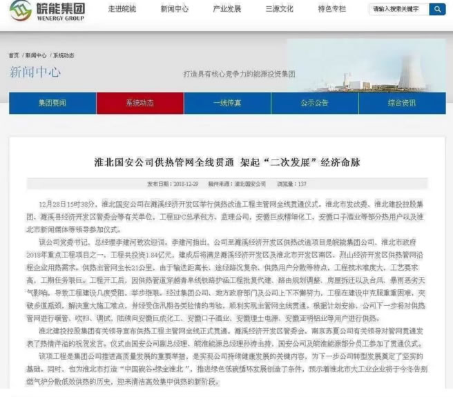 热烈祝贺江苏苏夏能源集团EPC总承包的 “淮北国安热网项目”全线运行