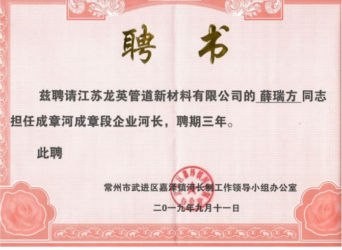 江苏苏夏能源集团子公司江苏龙英管道新材料有限公司不忘初心,反哺社会,积极投身家乡生态光彩行动,认捐常州市武进区嘉泽镇生态共建百万光彩基金,向新中国成立70周年献礼!