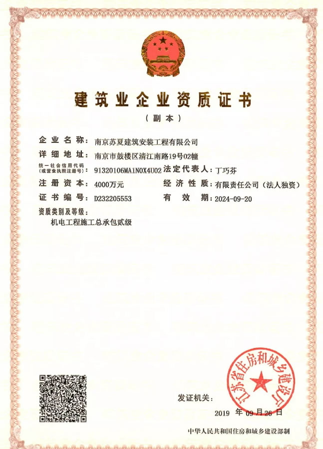江苏苏夏能源集团下属子公司南京苏夏建筑安装工程有限公司于国庆前夕顺利取得了机电工程总承包二级资质证书,未来将依托江苏苏夏能源集团母公司“长输低能耗热网”专利技术,快速发展,力争成为中国节能减排热网工程建设排头兵!